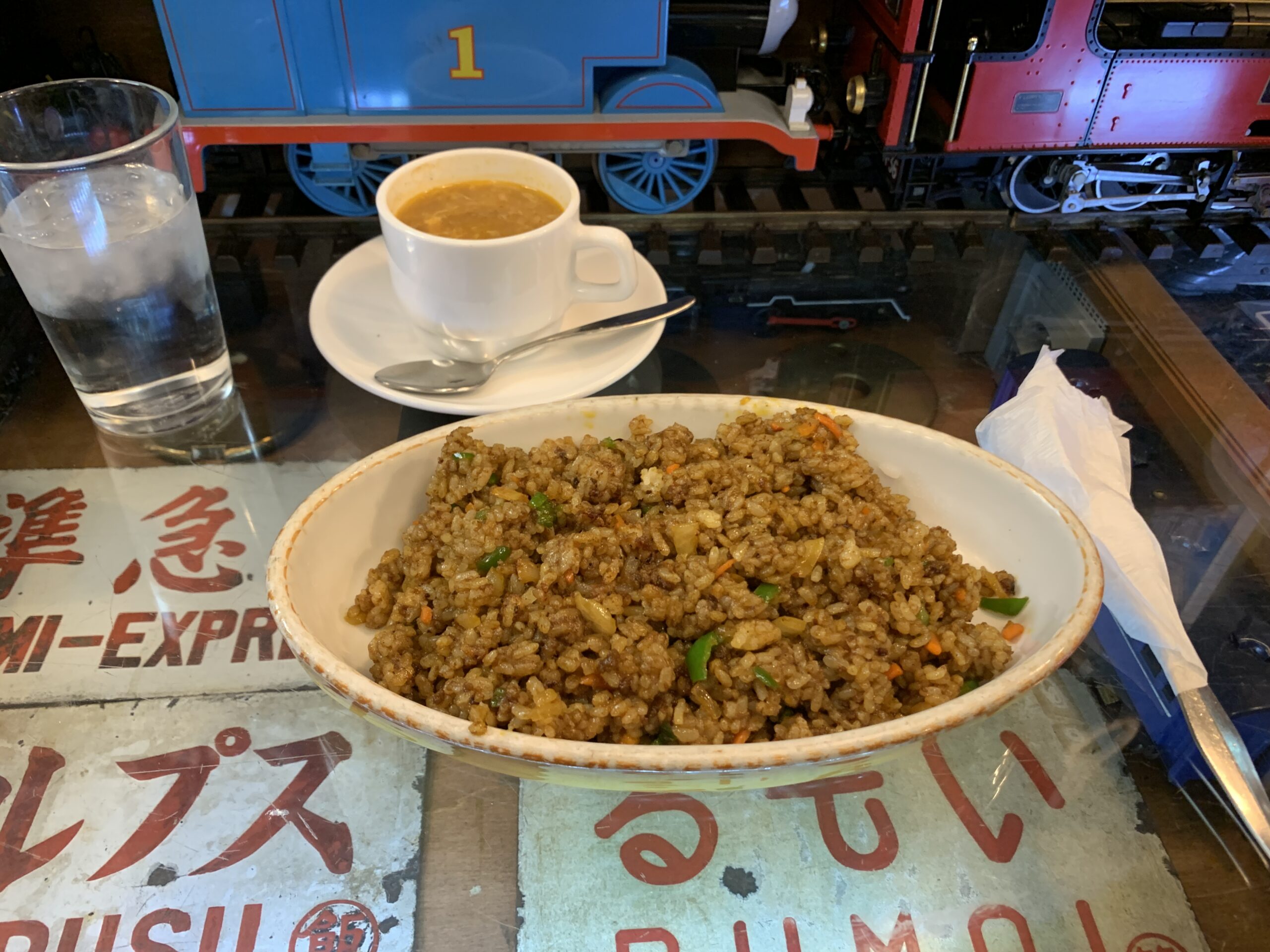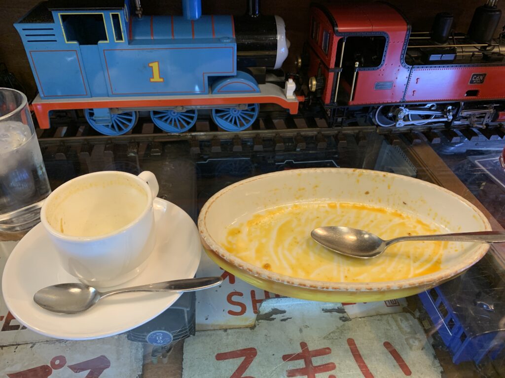 ボックス席にはミニチュアのSLで料理を提供されてました🚂